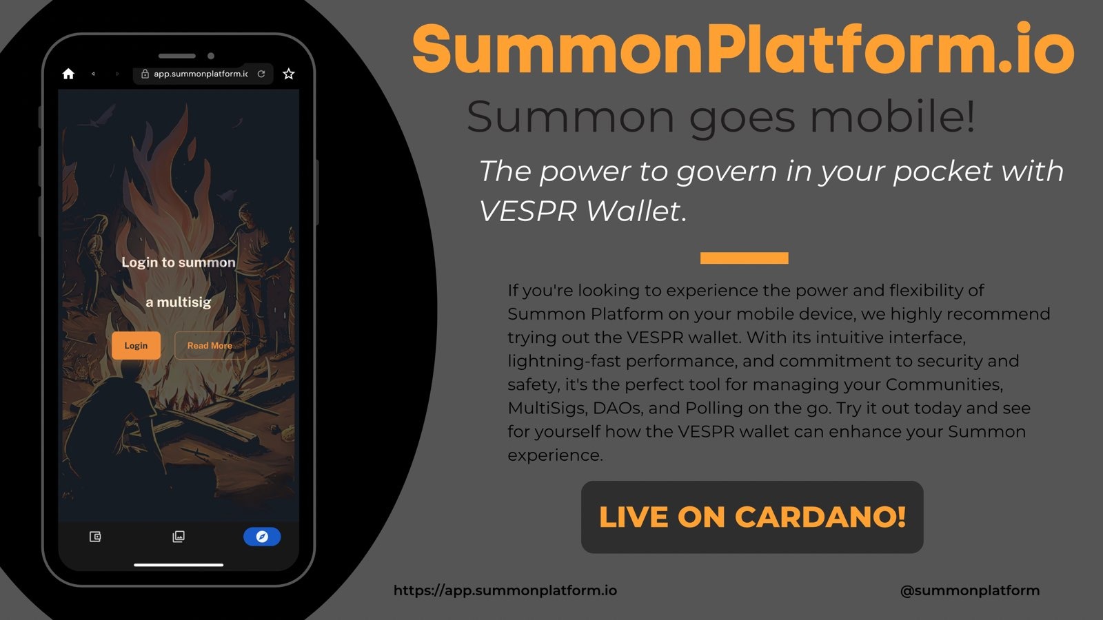 ZUG, SWITZERLAND, May 5, 2023/EINPresswire.com/ — The Summon Association is pleased to announce that the newly released Summon Platform is available now on VESPR, a Cardano mobile light wallet with dApp explorer for iOS and Android. VESPR allows Summon Platform users to easily manage their Communities, MultiSigs, DAOs, and Polling on their mobile device with a fast and intuitive interface