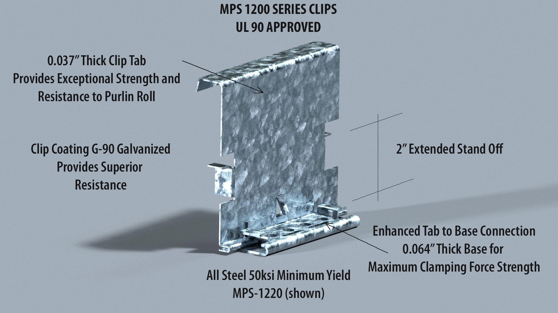 • An addition of a 2” extended standoff MPS-1220 clip to the MPS 1200 series for improved energy option due to reduced compression of thicker fiberglass blanket systems over the purlins/bar joists which aids in meeting higher energy requirements.