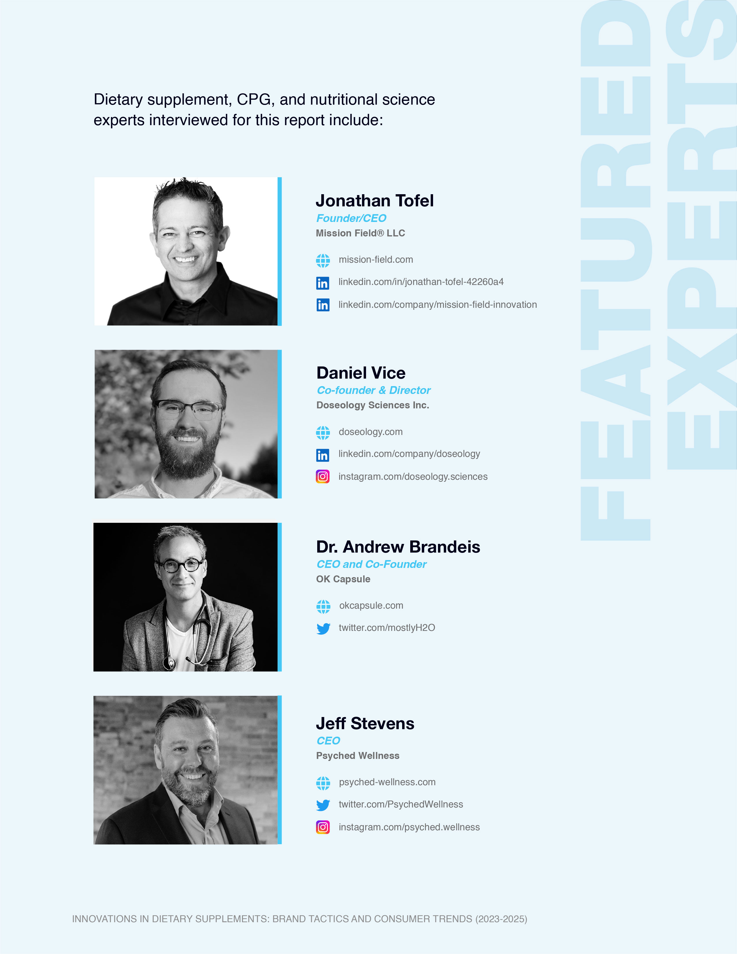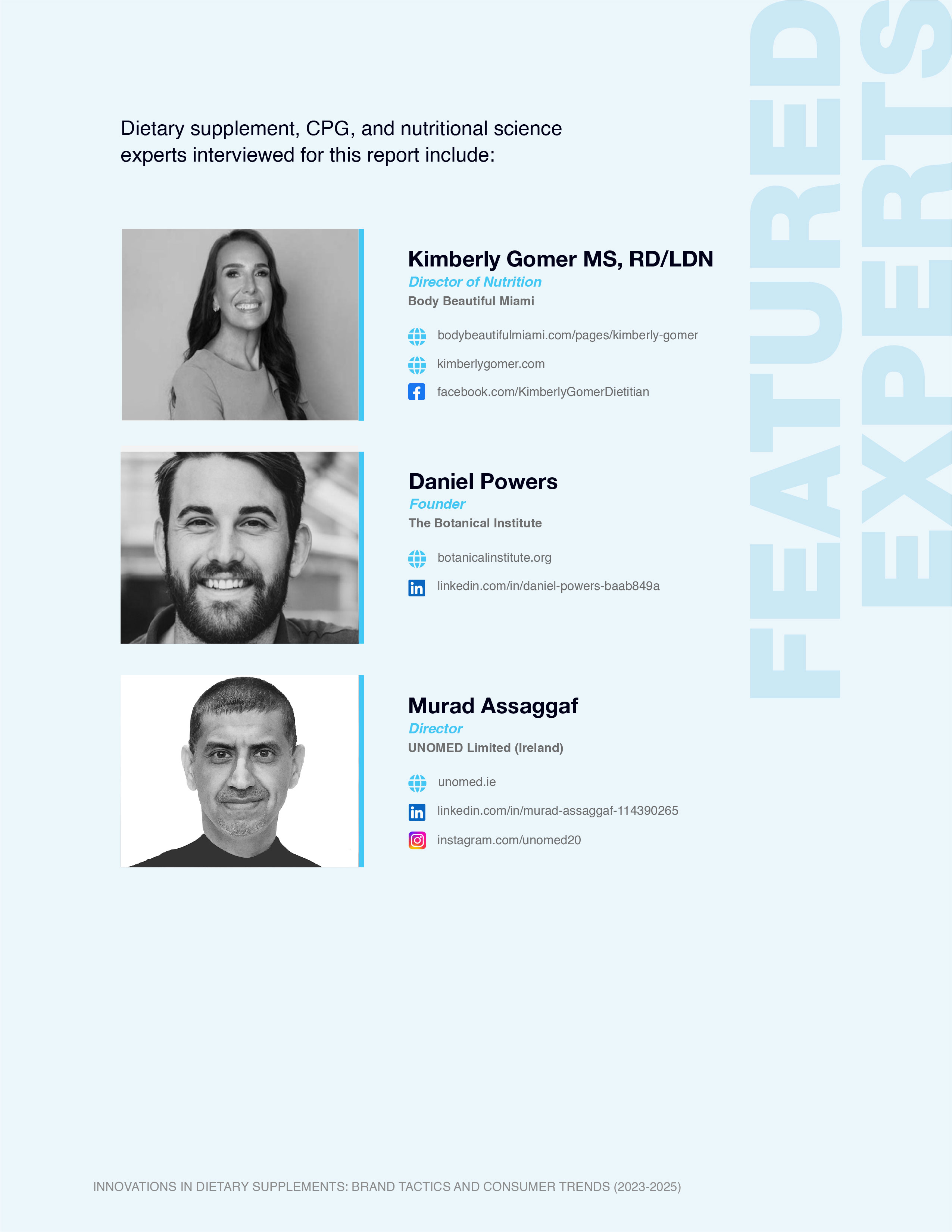 Dietary supplement, CPG, and nutritional science experts interviewed for this report include: