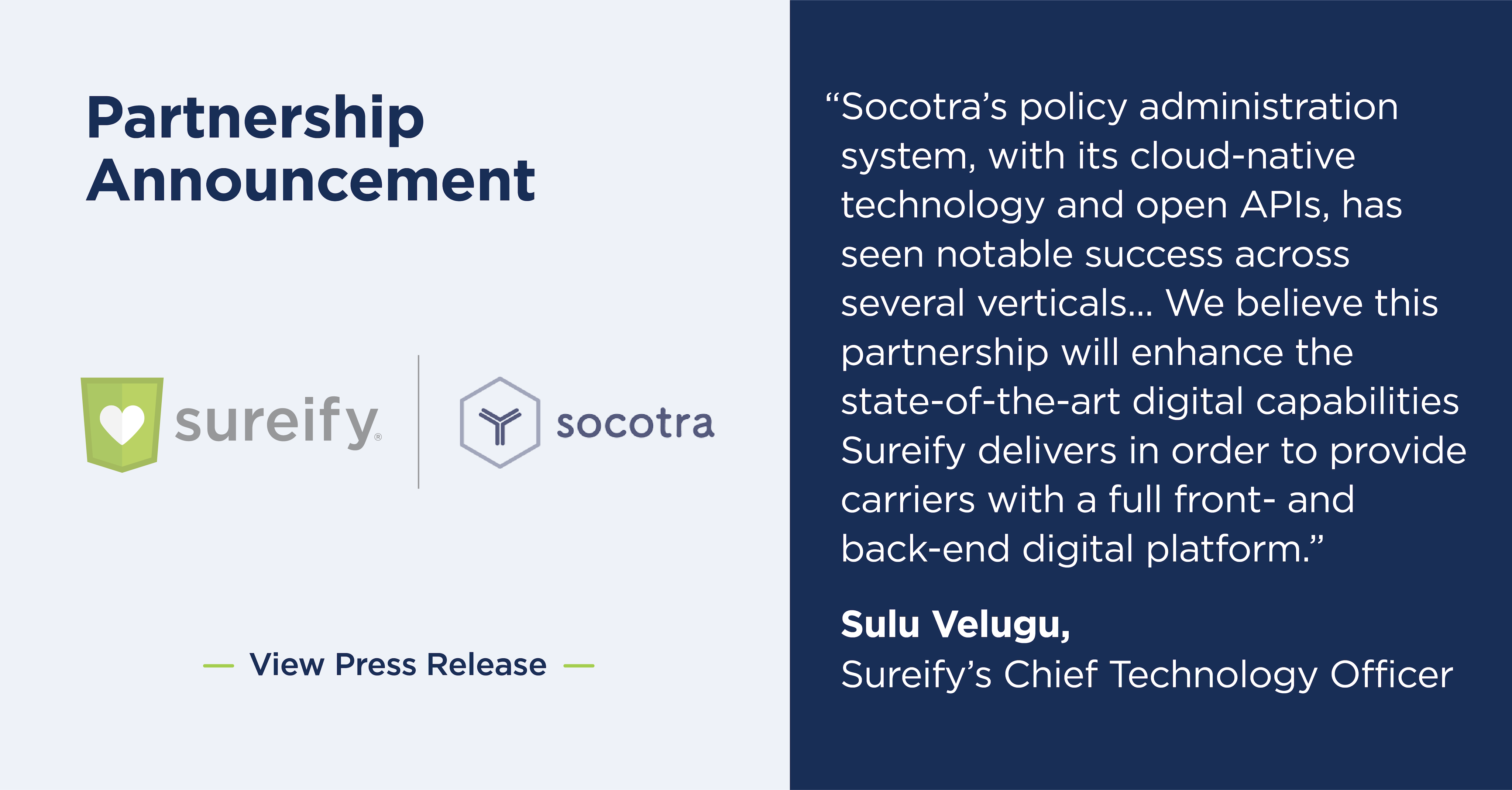 Sulu Velugu, Sureify’s Chief Technology Officer who built the company’s first integration with Socotra back in 2019, stated, “Socotra’s policy administration system, with its cloud-native technology and open APIs, has seen notable success across several verticals. We’re excited to partner with them as they expand further into the life insurance space. We believe this partnership will enhance the state-of-the-art digital capabilities Sureify delivers in order to provide carriers with a full front- and back-end digital platform.”