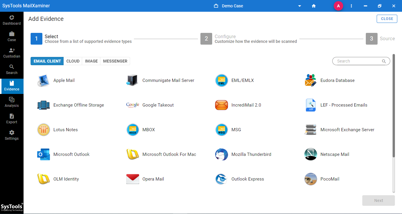 3. Supports 25+ Offline Mail File Types: One of the highly preferred features of this tool is that it supports multiple email file formats for email forensics analysis. The list includes Microsoft Outlook, Apple Mail, CommuniGate Mail Server, EML/EMLX, Eudora Database, Exchange Offline Storage, Google Takeout, IncrediMail 2.0, LEF – Processed Emails, Lotus Notes, MBOX, MSG, Microsoft Exchange Server, Microsoft Outlook For Mac, Mozilla Thunderbird, Netscape Mail, OLM Identity (.olk), Opera Mail, Outlook Express, PocoMail, Postbox, Sea Monkey, Spicebird, The BAT! Database, Windows Live Mail, eM Client & hMailServer.