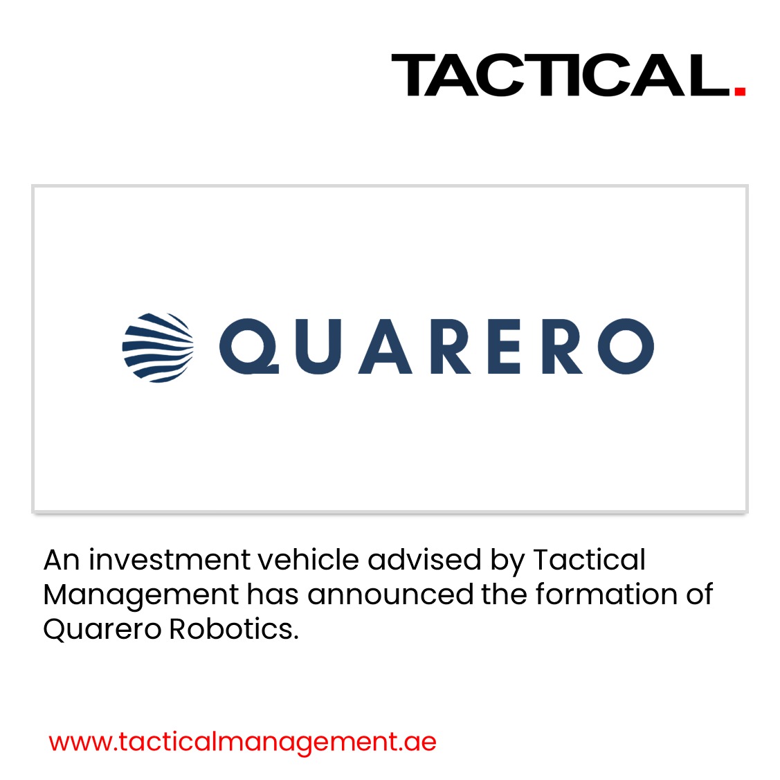 “We are honored to integrate Quarero AG into the Tactical Management family,” said Dr. Raphael Nagel, Founding Partner of Tactical Management. “Markus Köhnlein’s leadership, combined with Quarero AG’s technological prowess, positions us to redefine the landscape of the robotics industry. This acquisition not only enhances our innovation and technology offerings but also strengthens our strategic presence in the Swiss market.”