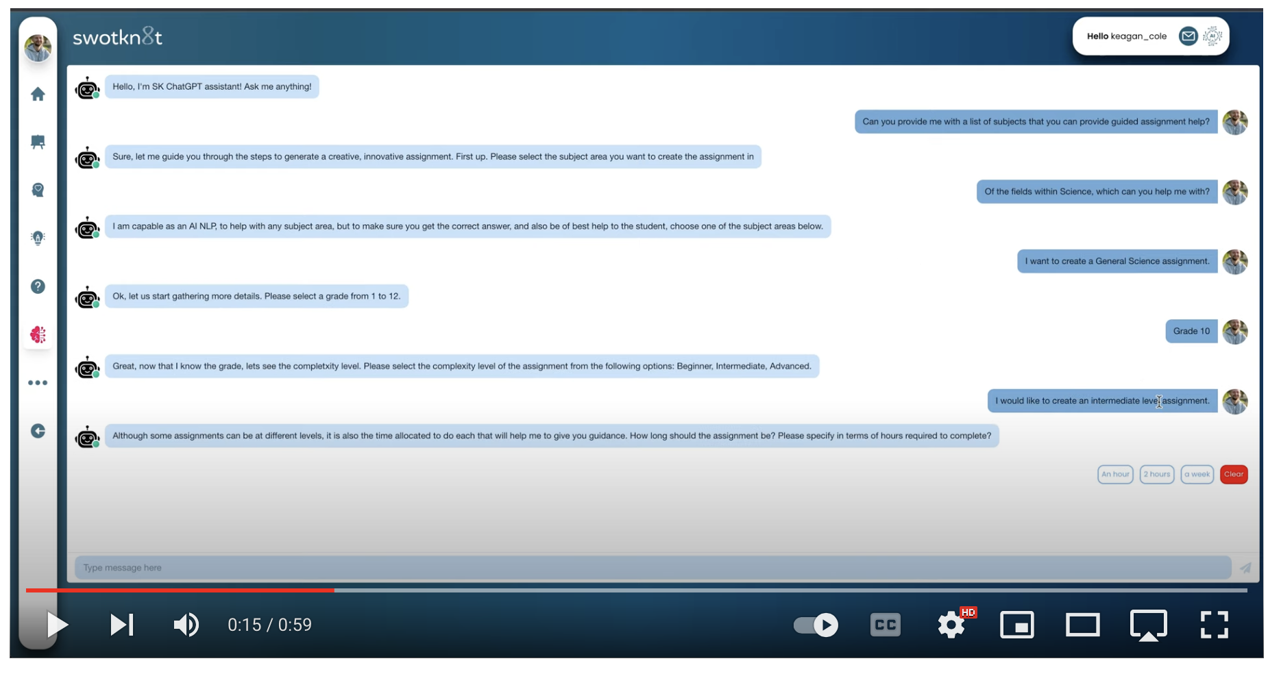 The assignment generator provides immediate access to information without having to run a cumbersome search or dive into a stack of papers. It dramatically speeds up information gathering and is a potent tool when trying to present assignments to students so they understand a new idea or concept. The AI enabled assistant significantly reduces time spent on creating assignments and substantially increases efficiency and efficacy when teaching.
