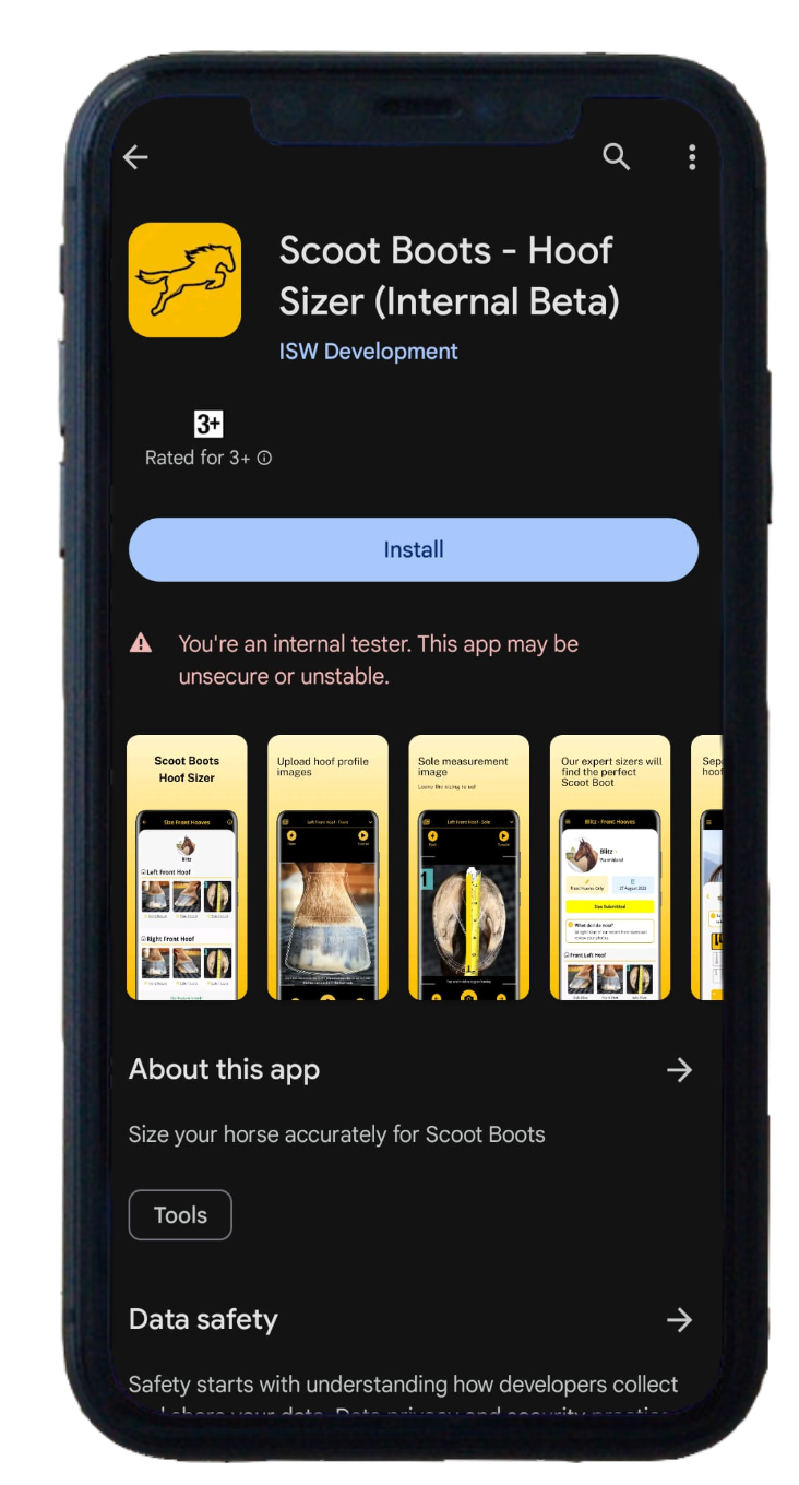 The free App is available on both IOS and Android App stores. Simply search Scoot Boot, select the Scoot Boot – Hoof Sizer and download.