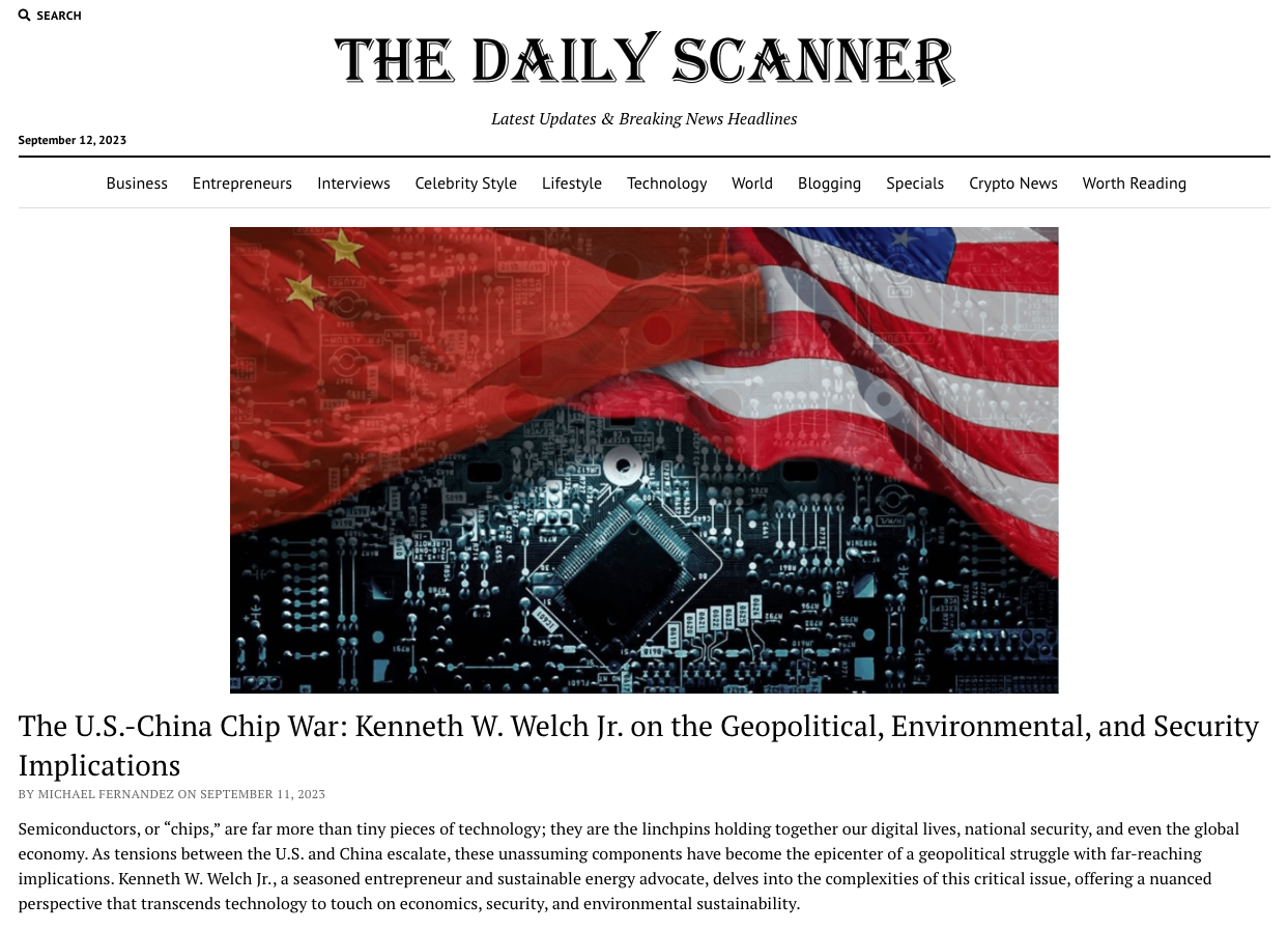 AUSTIN, TEXAS, UNITED STATES, September 13, 2023/EINPresswire.com/ — The Daily Scanner has recently published an investigative feature that explores the escalating tensions between the U.S. and China over semiconductor technology. The article, enriched by the insights of Kenneth W. Welch Jr., a seasoned entrepreneur and sustainable energy advocate, delves into the complexities of this critical issue that intersects economics, geopolitics, national security, and environmental sustainability.