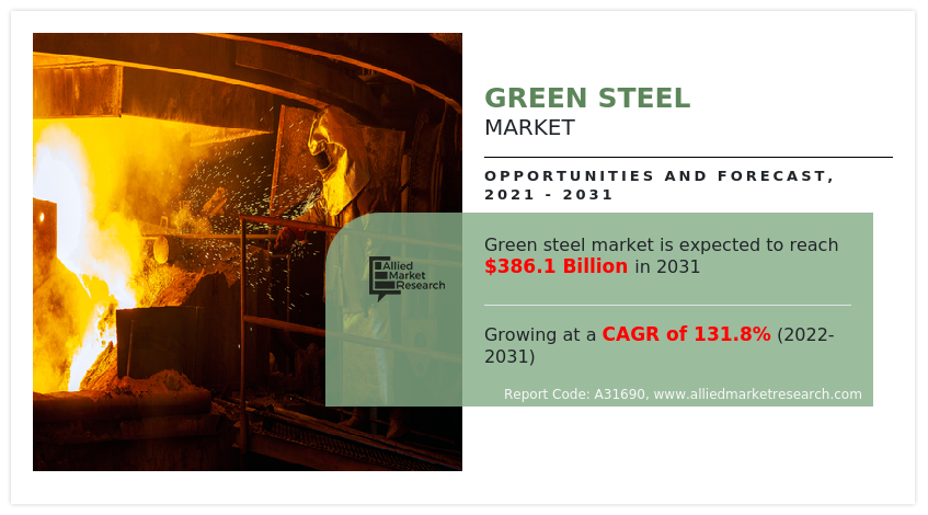 The global green steel market size was $83.4 million in 2021, and is projected to reach $386,110.3 million by 2031, registering a CAGR of 131.8% from 2022 to 2031