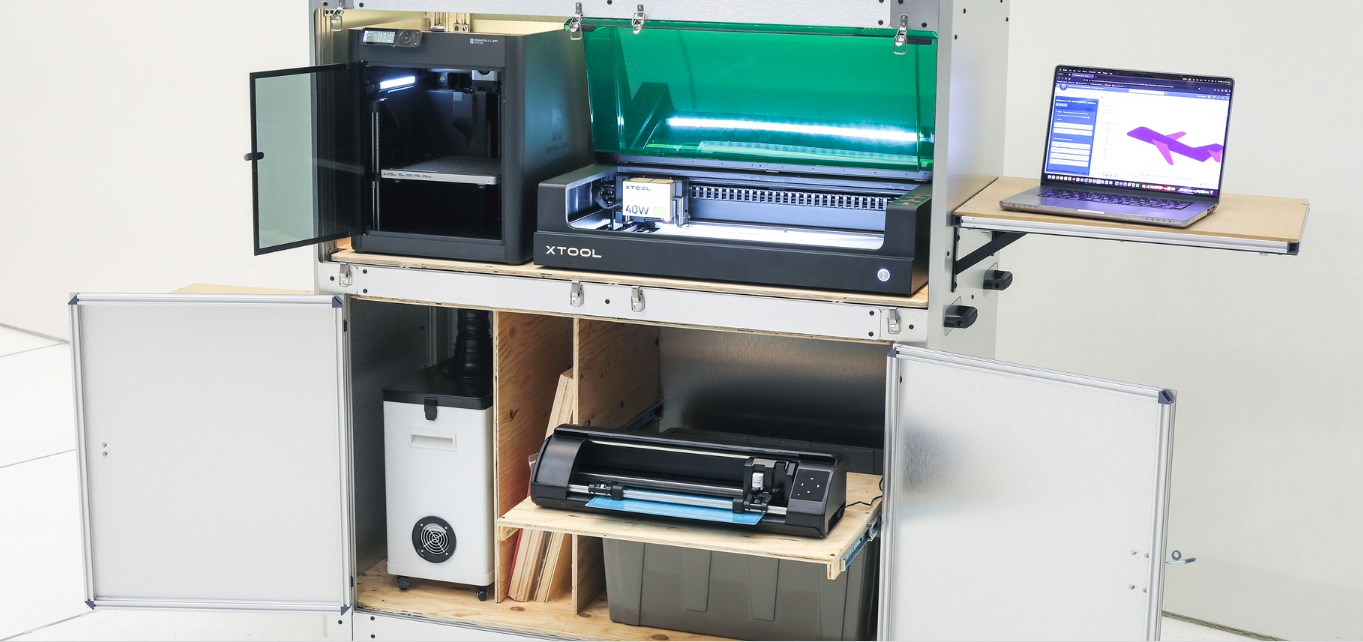 “Setting up and running a Fab Lab can be intimidating. So, we’ve taken care of that for you,” explains Dorsett. “This kit includes all the infrastructure you need, including built-in material storage and ventilation. You just supply the power.”