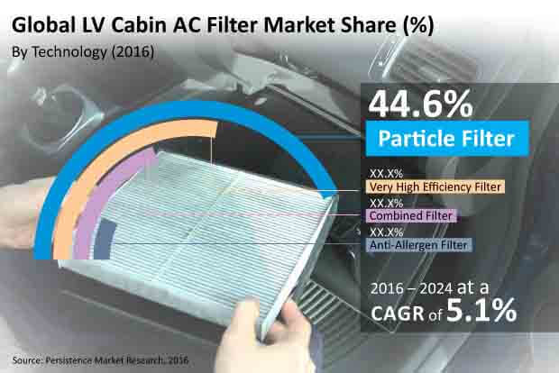 Persistence Market Research delivers key insights into the global LV cabin AC filters market in its latest report titled ‘LV Cabin AC Filters Market: Global Industry Analysis and Forecast, 2016–2024.’ The long-term outlook on the global LV cabin AC filters market remains positive, with market value anticipated to increase at a CAGR of 5.1% during the forecast period 2016 – 2024. Based on the technology type, the particle filter segment is expected to expand at a healthy CAGR in terms of value & volume over the period 2016 – 2024. By sales channel, the independent aftermarket segment is expected to witness a substantial CAGR in terms of volume and value over the forecast period.