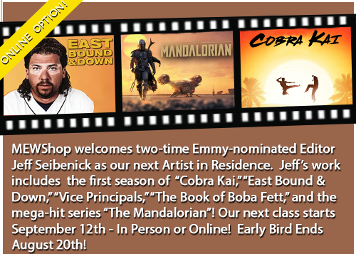 If you are interested in taking the class online please visit https://www.mewshop.com/six-week-intensive-online for all information and requirements. “We are pleased to announce “The Mandalorian” Editor Jeff Seibenick as our next Artist in Residence,” says MEWShop Director of Education Janet Dalton. “Jeff’ is a testament to building relationships in the editing room and putting in the hard work to fulfilling your dreams in this industry. We are super excited for our students to hear his journey and expertise in this upcoming class!” MEWShop’s early bird pricing ends August 20th.