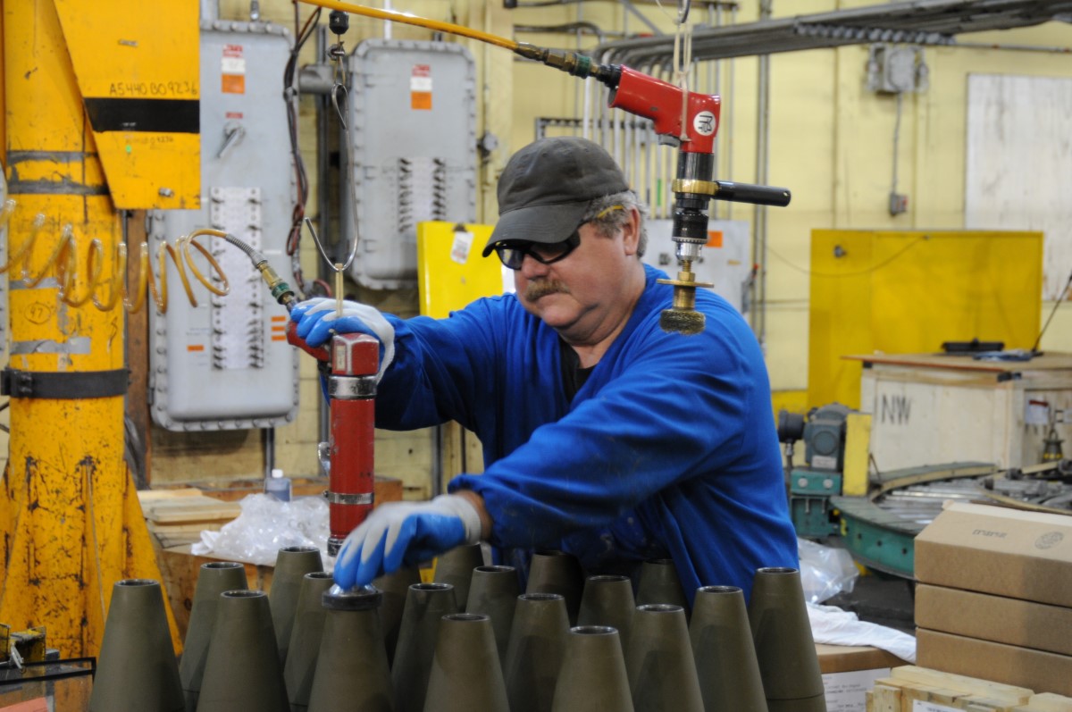 A contractor employee at Iowa Army Ammunition Plant performs a load, assemble and pack operation on a 155mm artillery round. (U.S. Army Photo, Iowa Army Ammunition Plant)