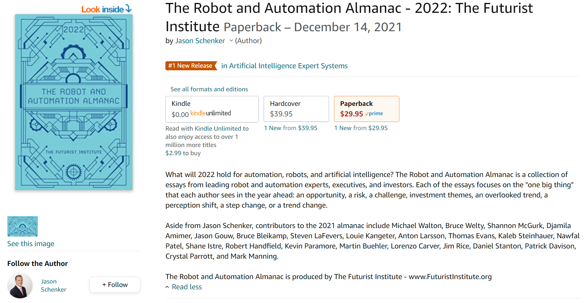 Jason Schenker, the Chairman of The Futurist institute and the world’s leading financial futurist, has been the driving force and editor behind The Robot and Automation Almanac. “Previous editions of The Robot and Automation Almanac have been 1 New Releases and even official 1 Bestsellers on Amazon. I am pleased to see the 2022 edition of this work gaining traction and getting positive attention.” Schenker shared. As for the general interest in this topic, Schenker noted that “Robots, automation, and AI have become more critical than ever in the wake of COVID-19, especially against a backdrop of high inflation, supply chain bottlenecks, goods shortages, labor market tightness, and COVID variant risks.”