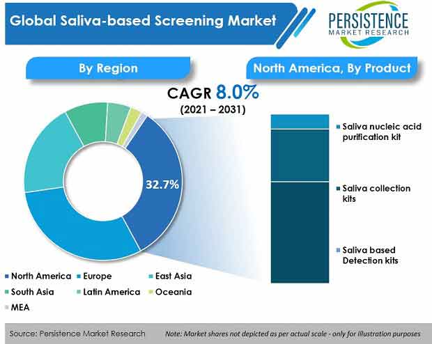 By region, North America is set to dominate the global saliva-based screening industry with a value share of around 32%. Europe is slated to be the second-largest leading region with a value share of 30%.