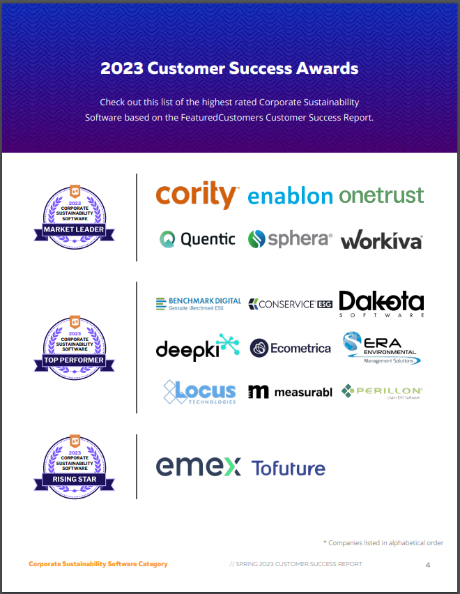 MAGGIE, FL, USA, May 30, 2023/EINPresswire.com/ — Today FeaturedCustomers published the Spring 2023 Corporate Sustainability Software Customer Success Report to give prospects better insight on which Corporate Sustainability Software would work best for their business according to real customer references.