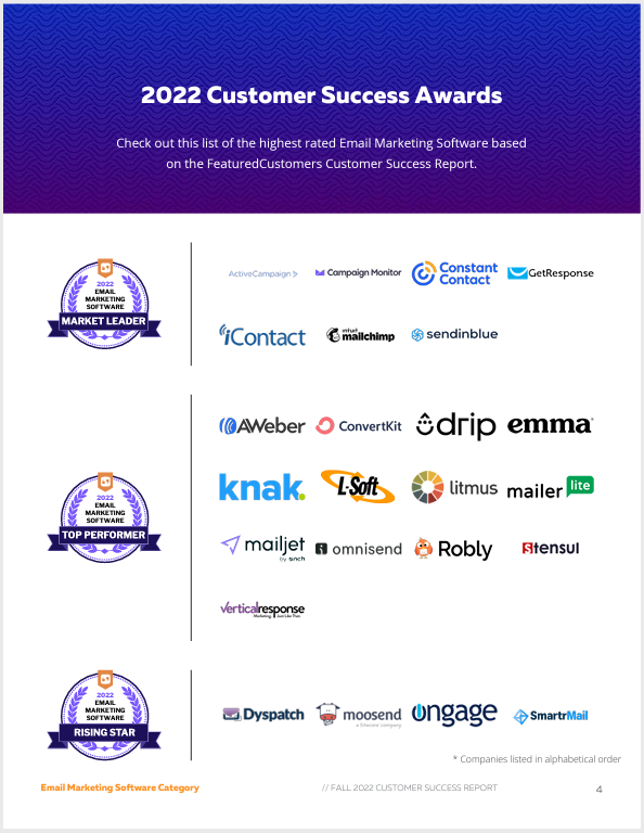 The highest rated vendors according to the Fall 2022 Email Marketing Software Customer Success Report are: