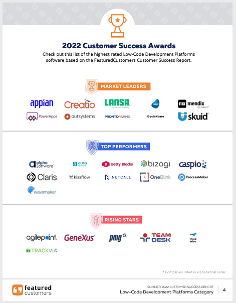The highest rated vendors according to the Summer 2022 Low-Code Development Platforms Customer Success Report are: