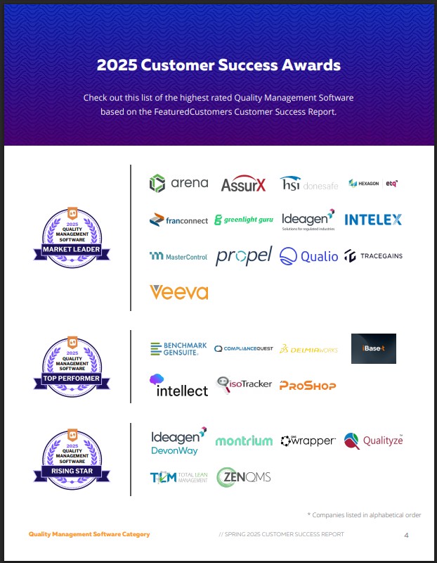 SUNRISE, FL, UNITED STATES, April 8, 2025 /EINPresswire.com/ — Today FeaturedCustomers published the Spring 2025 Quality Management Software Customer Success Report to give prospects better insight on which Quality Management Software would work best for their business according to real customer references.