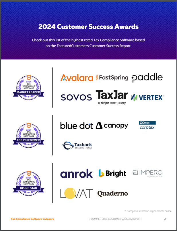 The highest rated vendors according to the Summer 2024 Tax Compliance Software Customer Success Report are: