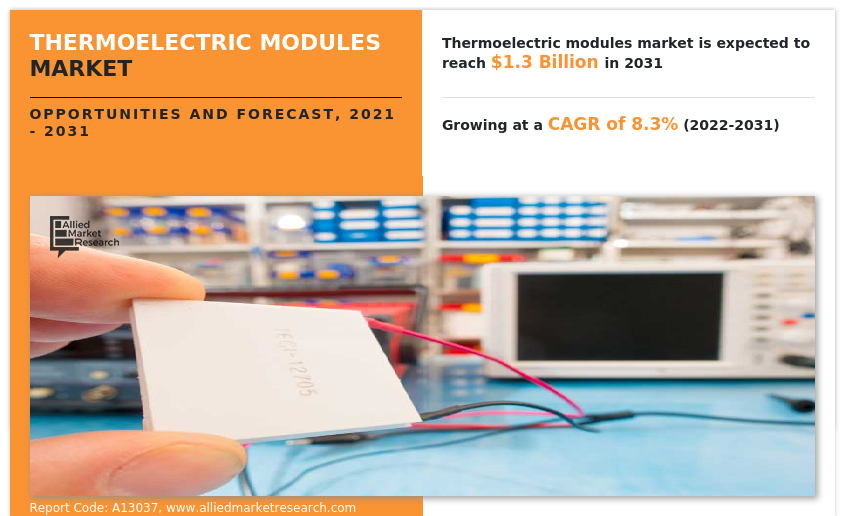 OREGAON, PORTLAND, UNITED STATES, February 9, 2023 /EINPresswire.com/ — As per the report published by Allied Market Research Titled “Thermoelectric Modules Market by Model (Single Stage, Multi Stage), by Type (Bulk Thermoelectric Modules, Micro Thermoelectric Modules, Thin-Film Thermoelectric Modules), by End-Use Application (Aerospace and Defense, Automotive, Consumer Electronics, Healthcare, Food and Beverage, Energy and Utility, Others): Global Opportunity Analysis and Industry Forecast, 2021-2031”