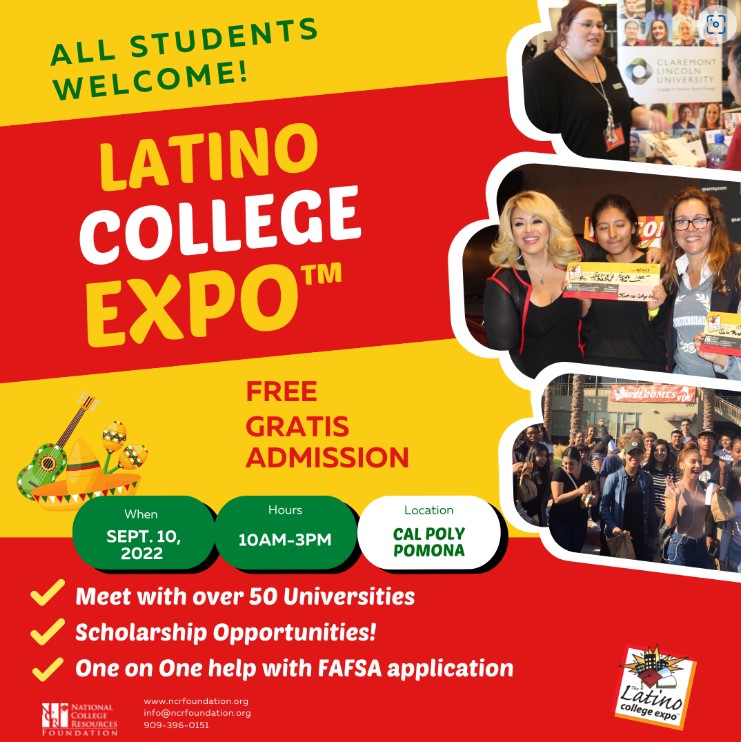 NORTH HOLLYWOOD, CA, UNITED STATES, September 2, 2022 /EINPresswire.com/ — National College Resources Foundation (NCRF), in celebration of “Hispanic Heritage Month” will host its 9th Annual Latino College Expo™, at Cal Poly Pomona, Bronco Student Center, 3801 W. Temple Ave., Pomona, California 91768 on Saturday, September 10, 2022, from 10 am – 3 pm (PST). The free event will allow students to gain access to colleges and universities, highlighting Hispanic Serving Institutions (HSIs), and other educational programs.
