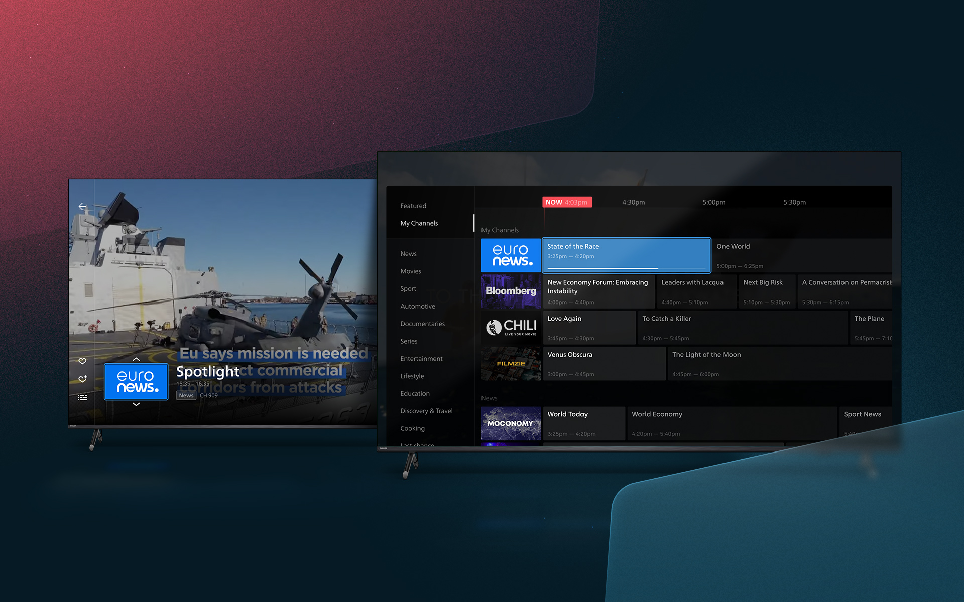 Partnering with Euronews, Bloomberg TV, Red Bull TV, CHILI, FUNKE Digital, Blue Ant Media, Insight TV and Love TV Channels, it strengthens its content offering