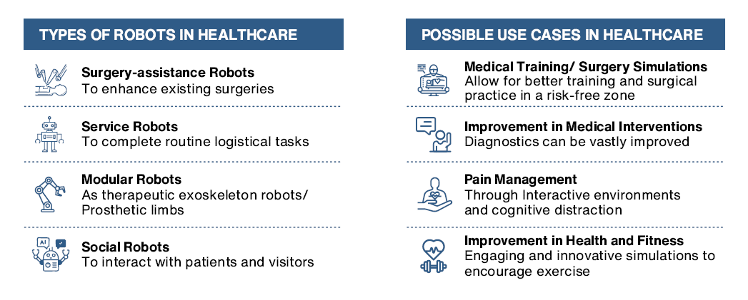 Robotics and Virtual Reality (VR) in healthcare witnessed remarkable advancements, contributing to enhanced patient care, medical training, and innovative treatment approaches. First-of-its-kind robotic surgery was performed in various medical settings such as successful robotic liver transplant was performed at Barnes-Jewish Hospital by a surgical team from Washington University School of Medicine and minimally invasive gastric sleeve procedure using a surgery robot with magnetic technology by Cleveland Clinic, showcasing the continuous advancements of robotic-assisted technologies in healthcare. To further assist surgical procedures, the evolution of digital twins for surgery has marked a transformative era in healthcare. Digital twins have shown diverse and impactful applications in drug discovery, remote monitoring, personalization and operational efficiency.