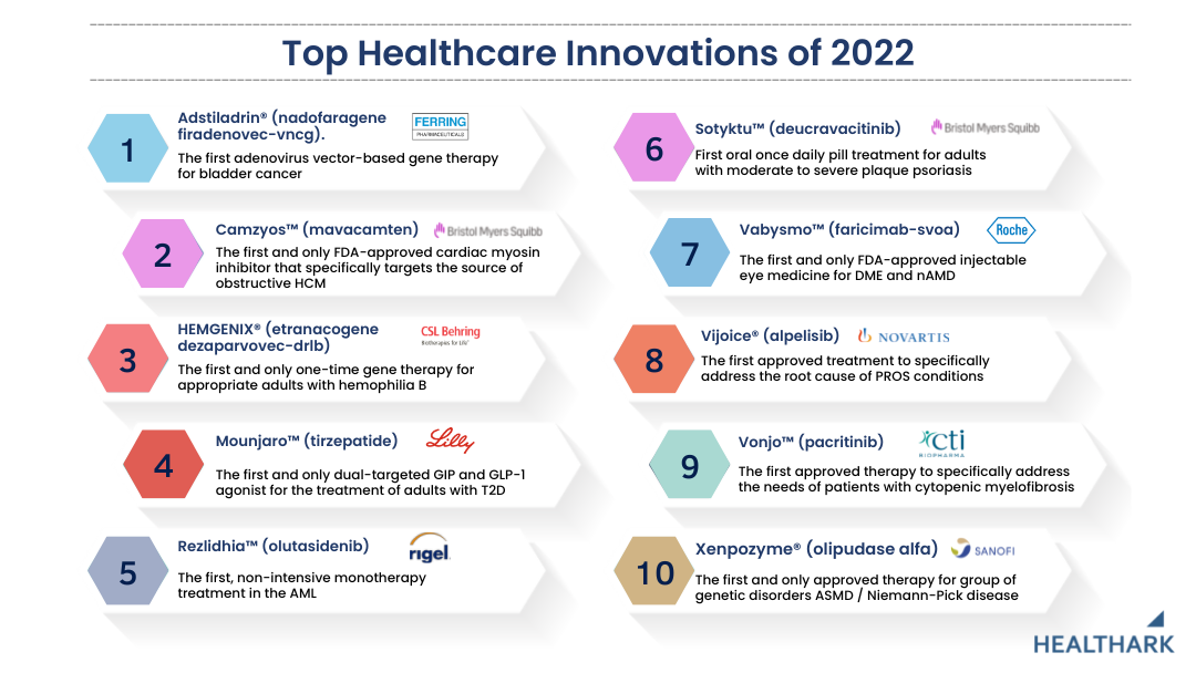 AHMEDABAD, GUJARAT, INDIA, February 1, 2023 /EINPresswire.com/ — Healthark Insights has recently launched a research report titled “Top 10 Healthcare Innovations in 2022”, focused on capturing the top product innovations in the biopharmaceutical industry that were approved during the year 2022. Healthark Insights team tracked and identified 50 plus innovations that were approved and came to the market during the year 2022 that demonstrated the potential to be a gamechanger in the healthcare ecosystem. The 10 innovations mentioned in the report were determined by gathering key information including number of lives affected, focus area, commercialization and complexity of problem solved. Each innovation was rated based on the impact on the future of health and its commercialization potential. This helped to prioritize the products to make it to the report.