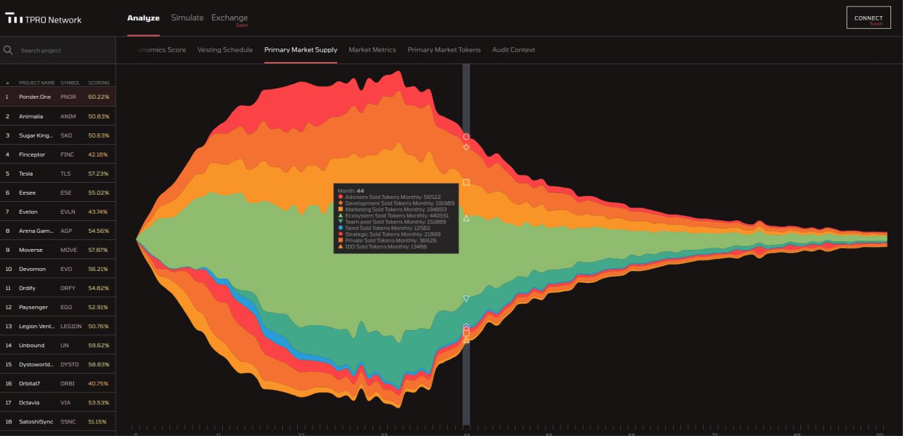 On TPRO Network Platform, users can analyze and simulate growth scenarios of project tokens’ Primary Market Supply, Market Cap, FDV, Volume, and many other indicators and to add their own custom simulations.
