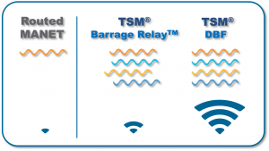 The TSM waveform’s new DBF mode enables multiple mobile nodes in random distribution to perform beamforming to mobile destinations, resulting in a coherent power gain. This patent-protected technology represents the industry’s first-ever commercial implementation of distributed beamforming technology, delivering the following advantages: