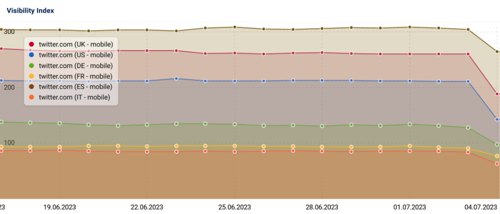 According to data provided by Sistrix, Twitter has seen its visibility plummet by 25% in critical markets such as the United Kingdom (28% drop), France (17% drop), Italy (26% drop), Germany (25% drop), and Spain (14% drop).