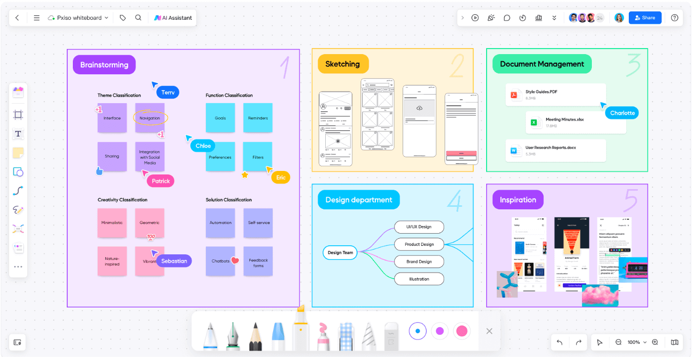 3. Boundless Whiteboard Functionality: Pixso provides an unlimited scope for whiteboarding, a critical tool for idea organization and team management. The whiteboard feature extends beyond design, serving as a platform for ideation and project coordination.