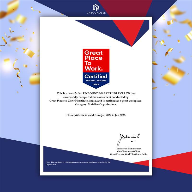 Following the certification, UNBOUND MARKETING PVT now appears on the exclusive Great Place to Work-Certified™ section of the Great Place to Work® Institute’s website.