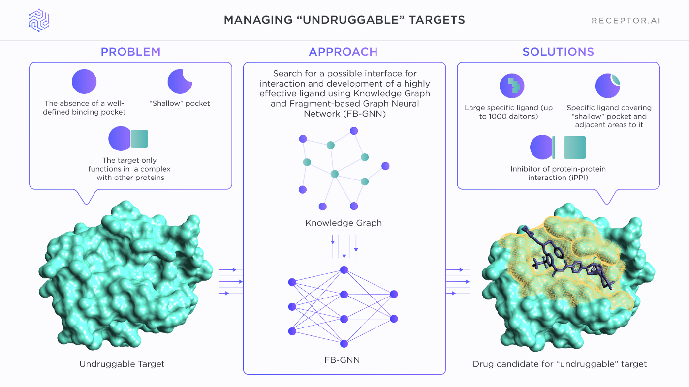 The problem of undruggable targets is too complex and too large to be solved by a single technique. Different classes of undruggable targets require different approaches, and there is no guarantee that any undruggable target could be made druggable. Nevertheless, even a small fraction of new druggable targets may lead to huge progress in pharmacology and medicine and result in cures for untreatable diseases. Receptor.AI is joining other companies in chasing the Holy Grail of undruggable targets using its unique technology stack and scientific expertise.