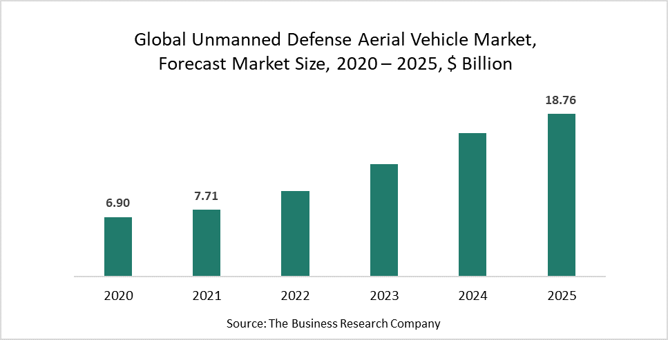 The global defense unmanned aerial vehicle market size is expected grow from $6.9 billion in 2020 to $7.71 billion in 2021 at a compound annual growth rate (CAGR) of 11.7%. UAV industry growth is mainly due to the companies resuming their operations and adapting to the new normal while recovering from the COVID-19 impact, which had earlier led to restrictive containment measures involving social distancing, remote working, and the closure of commercial activities that resulted in operational challenges. The military UAV market size is expected to reach $18.76 billion in 2025 at a CAGR of 25%.