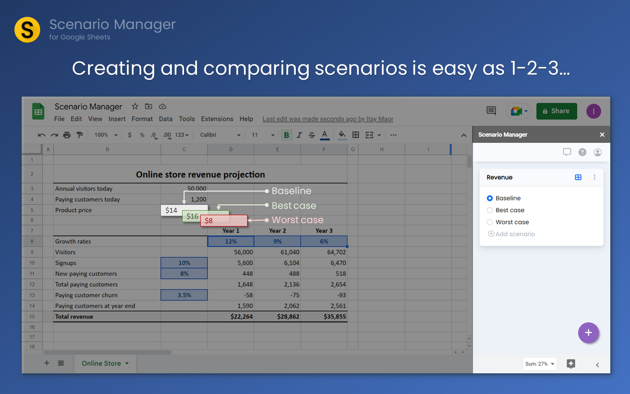 Scenario Manager is a powerful tool that allows users to create and manage multiple scenarios within a single Google Sheet. With Scenario Manager, users can quickly and easily create different versions of their data, compare them side-by-side, and choose the best option for their needs. Such capabilities, that up until now were only available in MS Excel, are now available for the millions of users of Google Sheets.