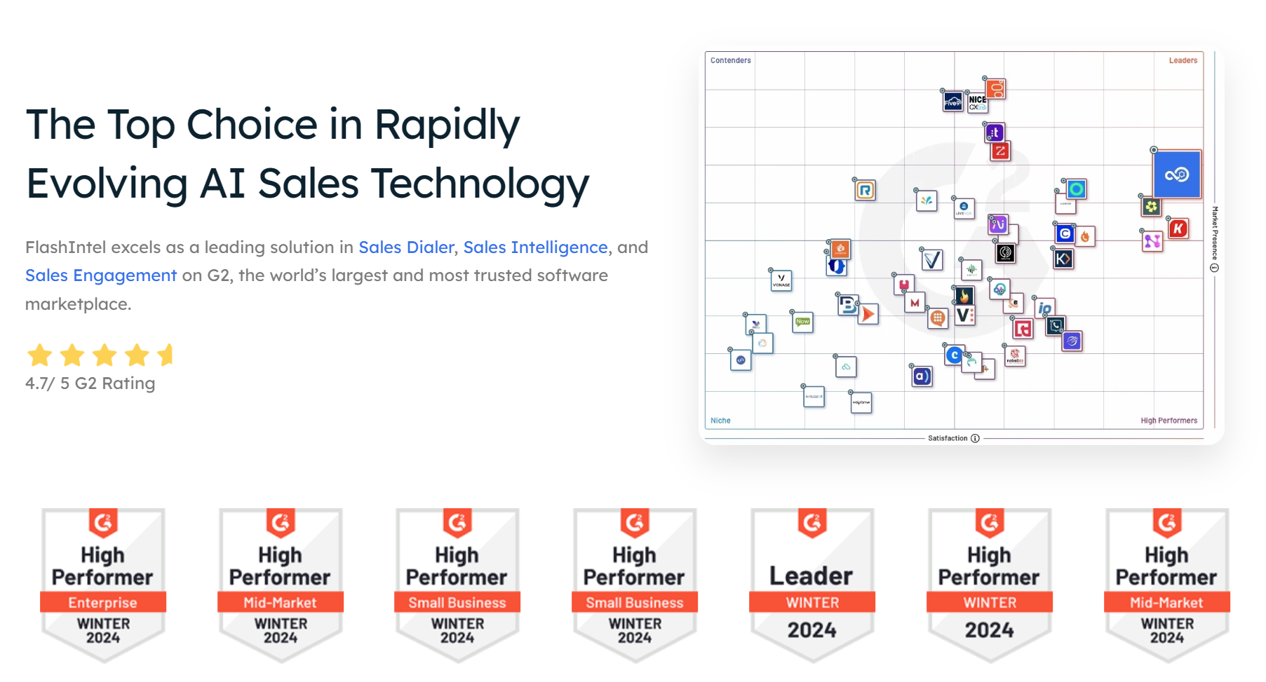 FlashIntelは、米国最大のソフトウェア評価サイト「G2」において、2024年度のセールスイネーブルメントツールの年間ランキングで上位に位置づけられ、その革新性と実績が高く評価されています。