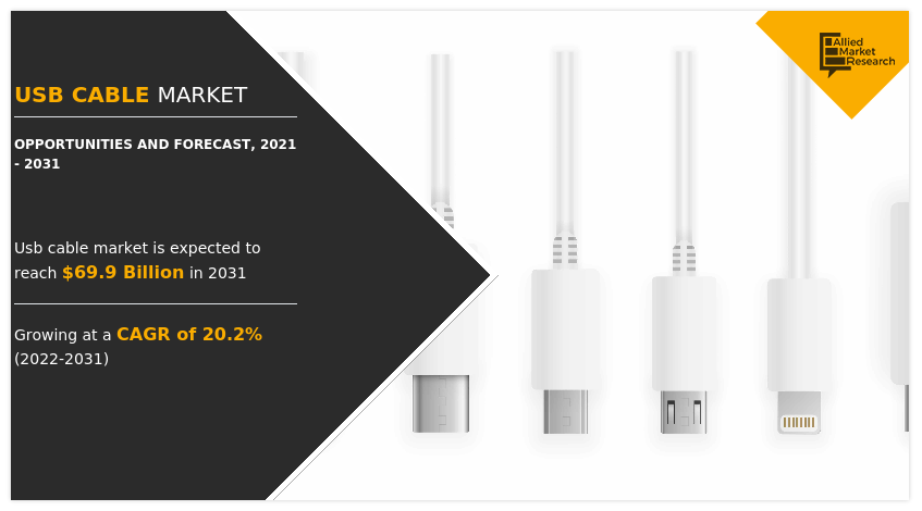 USB Cable Market Statistics 2021-2031: The global USB cable market was valued at $12.73 billion in 2021, and is projected to reach $69.86 billion by 2031, growing at a CAGR of 20.24% from 2022 to 2031.