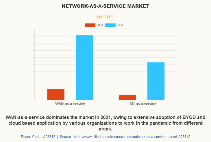 Based on type, the WAN-as-a-service segment held the largest share in 2021, accounting for more than two-thirds of the global network-as-a-service market share, and would maintain its dominance during the forecast period. However, the LAN-as-a-service segment is estimated to witness the fastest CAGR of 22.6% during the forecast period.