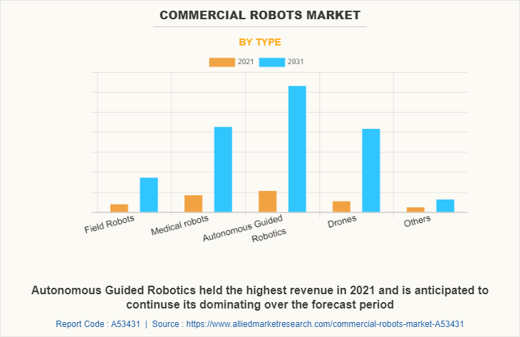 On the basis of type, the autonomous guided robotics segment held the largest market share in 2021, accounting for more than one-third of the global commercial robots market and is estimated to maintain its leadership status throughout the forecast period. However, the drones segment would portray the fastest CAGR of 23.7% by 2031. The report also discusses field robots, medical robots, and others segment.