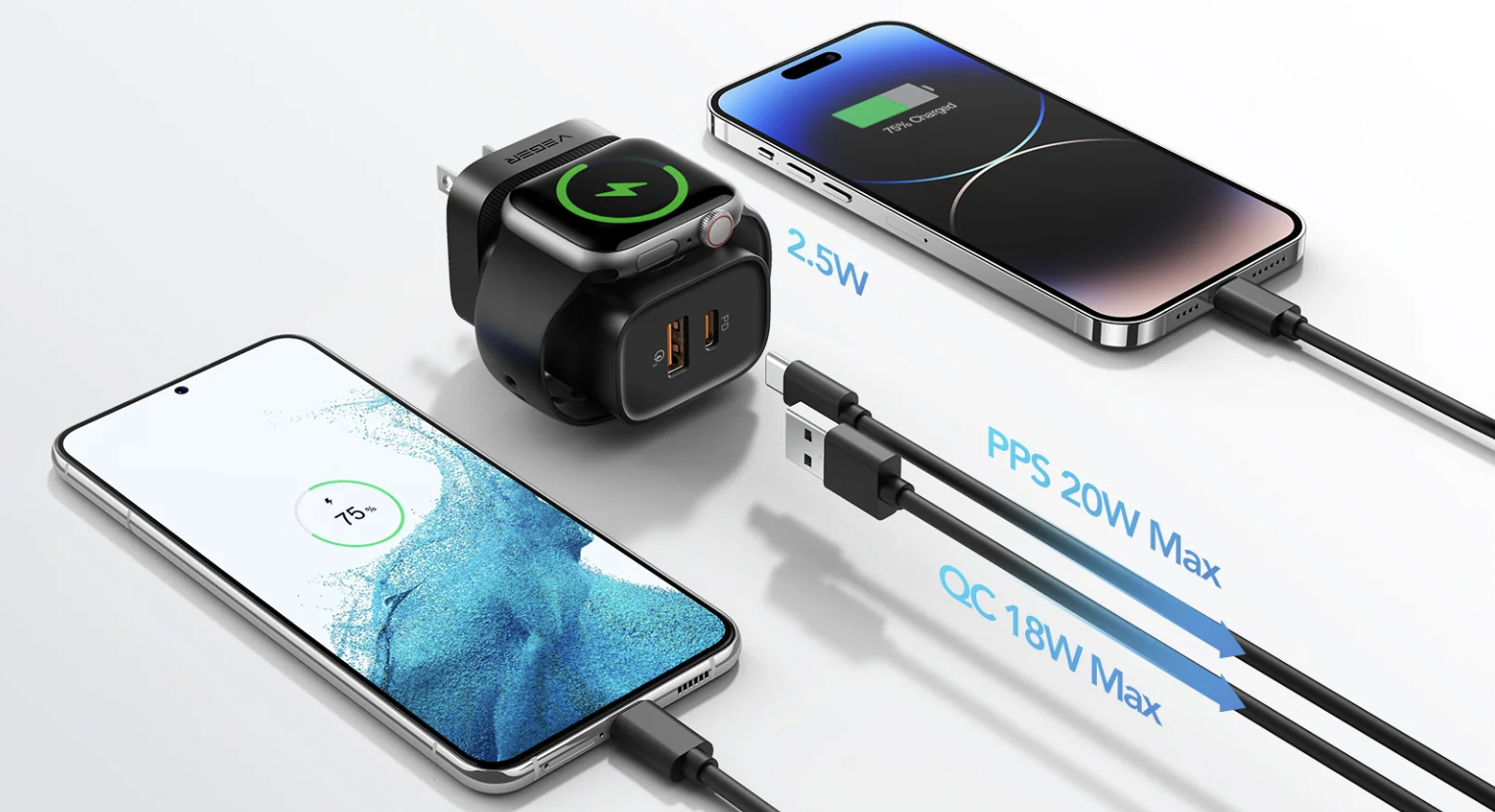 A revolutionary 3-in-1 wall charger with Apple Watch wireless charging pad. Charge up to 3 devices efficiently and safely with QC3.0, PD3.0, and Type C support.
