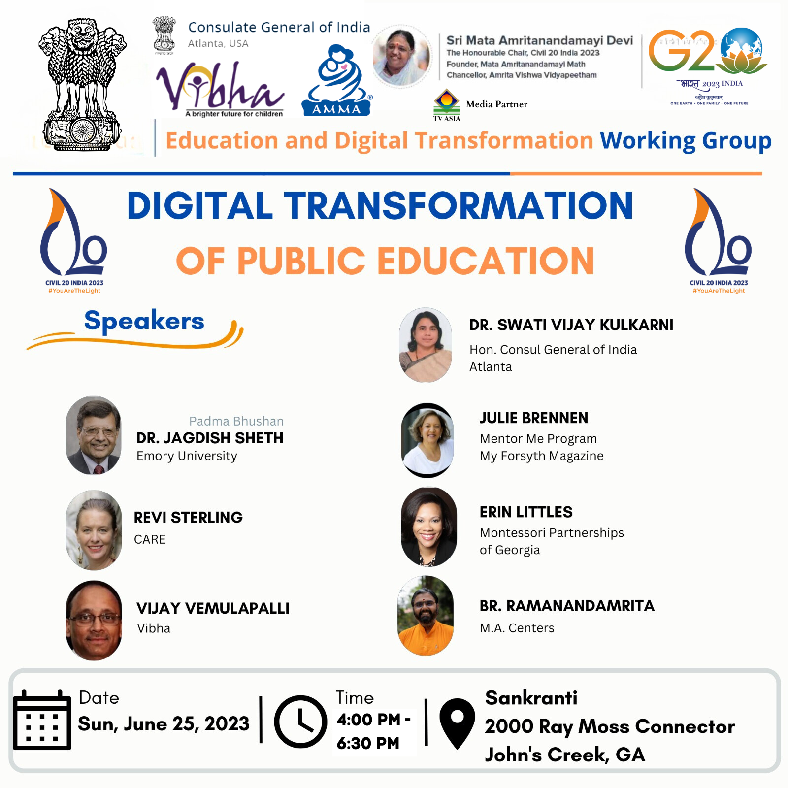 ATLANTA, GA, UNITED STATES, July 4, 2023/EINPresswire.com/ — Vibha, a leading nonprofit organization dedicated to providing high-quality education to underprivileged children, proudly co-organized the C20 Education Working Group Summit on ‘Digital Transformation in Public Schools.’ along with Mata Amritanandamayi Centers, U.S.A., and the Consulate General of India, Atlanta. This event, featuring a keynote speech by Dr. Swati Vijay Kulkarni, Consul General of India, Atlanta, U.S.A., and inspiring talks by prominent speakers like Padma Bhushan Dr. Jagdish Sheth, occurred on Sunday, June 25, in Atlanta, Georgia, and attracted 100+ attendees. The event was a resounding success, achieving its objective of fostering dialogue and generating policy recommendations for G20 Leaders.