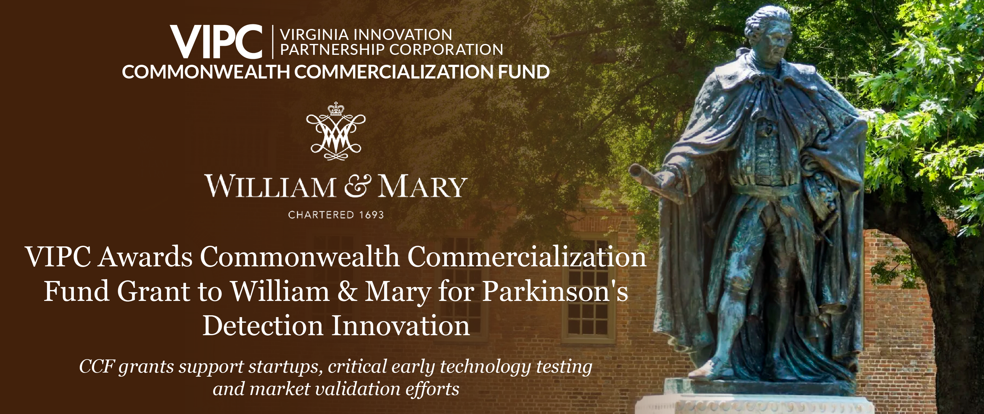 RICHMOND, VIRGINIA, UNITED STATES, August 17, 2023/EINPresswire.com/ — The Virginia Innovation Partnership Corporation (VIPC) today announced that William & Mary has been awarded a Commonwealth Commercialization Fund (CCF) grant of $126,000 to support the creation of a university spinout focused on an innovative product for sufferers of Parkinson’s Disease. VIPC’s CCF programs have distributed more than $51 million to Virginia-based startups, entrepreneurs and university-based inventors since 2012.