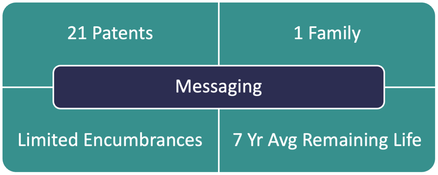 The Messaging patent portfolio contains 21 US patents within a single patent family. The patent portfolio covers enterprise and social network messaging. The patented technology includes generating dynamic profiles for users of messaging platforms to track online status, contacts, and collecting hyperlinks and web content from messages. The key pieces of this portfolio were developed in 2007, demonstrating its early leadership in web and messaging applications.
