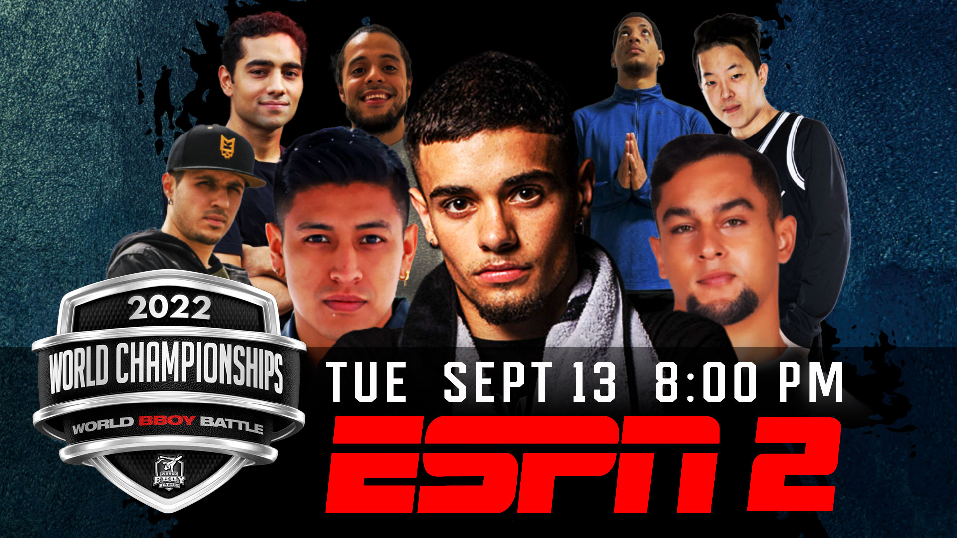 NEW YORK, NEW YORK, USA, September 13, 2022 /EINPresswire.com/ — The 2022 World Bboy Battle Championships will air on Tuesday, September 13 at 8:00 PM on ESPN 2. This professional sports tournament for breaking features the World Bboy Battle League’s eight national champions vying for the sport’s world title, championship belt and grand prize money. The competition is a one-on-one single-elimination with style rounds in Footwork, Powermove and Burner, under the Pro Breaking League’s competition format and scoring system. Competitors representing their countries are Bboys Kid Karam(UK), Dosu(PE), Neosan(FR), Gravedad(DO), Bugy(RO), Jose(MX), Loose Lee(KR) and Spindian(US).