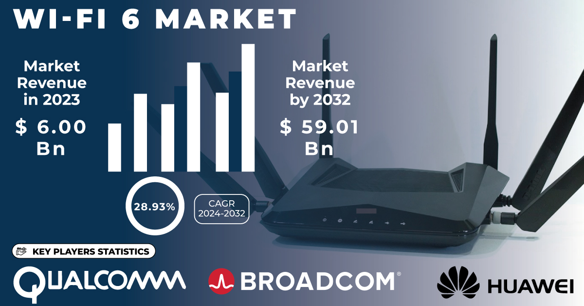 As Per the SNS Insider,“The Wi-Fi 6 Market Size was valued at USD 6.00 billion in 2023 and is expected to reach USD 59.01 billion by 2032, growing at a CAGR of 28.93% from 2024 to 2032.”