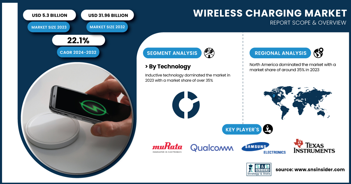 According to the SNS Insider Report,“The Wireless Charging Market Size was valued at USD 5.3 billion in 2023 and is expected to grow to USD 31.96 billion by 2032, at a CAGR of 22.1% over the forecast period of 2024-2032.”