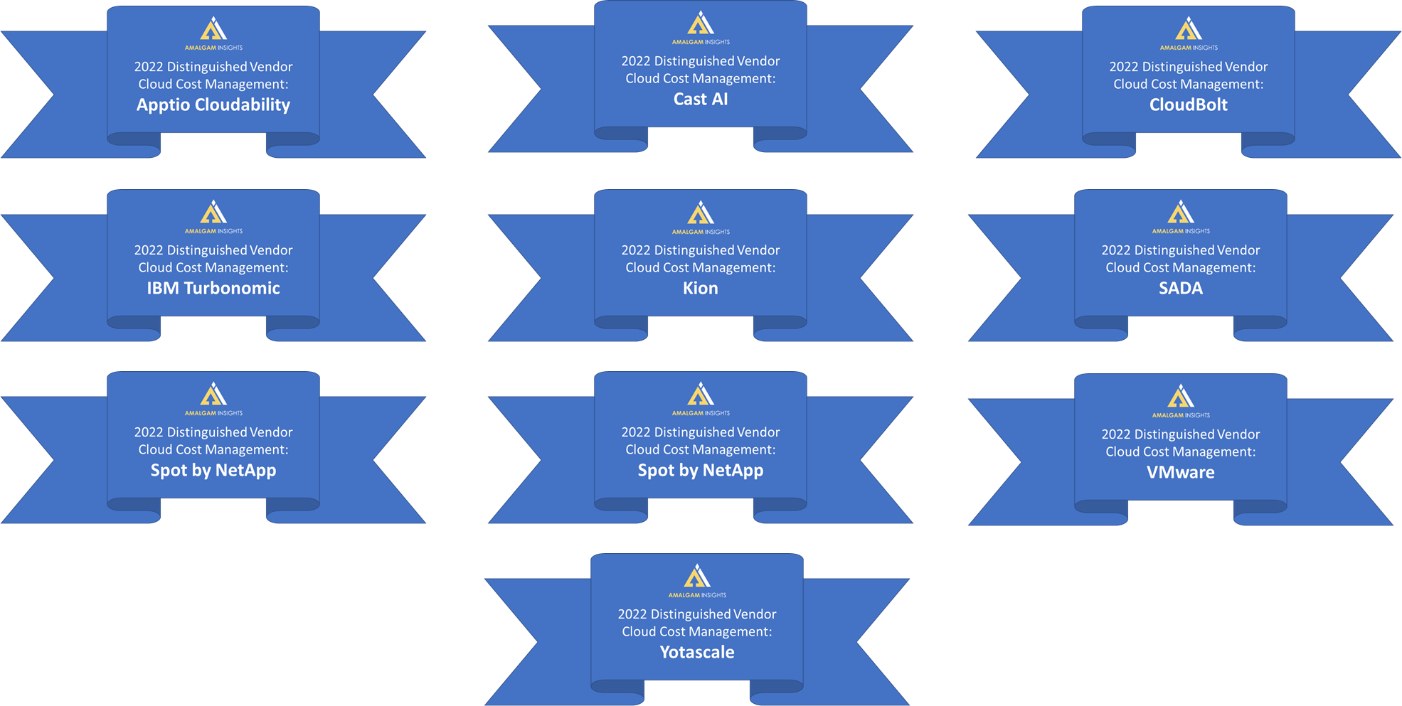 2022’s Distinguished Vendors for Cloud Cost Management are: Apptio Cloudability, Cast AI, CloudBolt, IBM Turbonomic, Kion, SADA, Spot by NetApp, Sync Computing, VMware (CloudHealth), and Yotascale. This Amalgam Insights SmartList features profiles of each of the 10 vendors including key differentiators, offering, competitive positioning, roadmap, and Amalgam Insights’ expert recommendations for engaging each vendor.