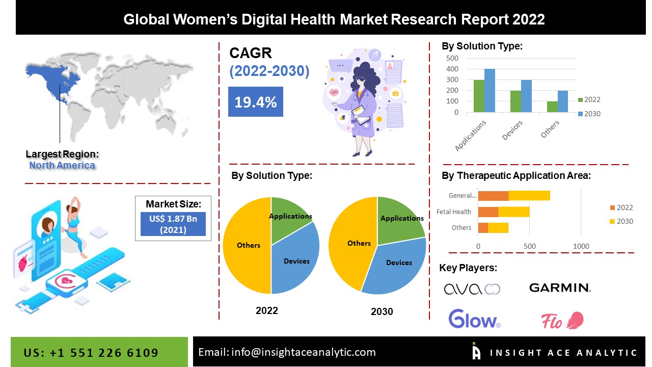 According to the latest research by InsightAce Analytic, the global Women’s Digital Health market is valued at US$ 1.87 Billion in 2021, and it is expected to reach US$ 9.13 Billion by 2030, with a CAGR of 19.4% during a forecast period of 2022-2030.