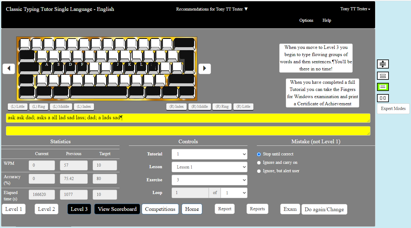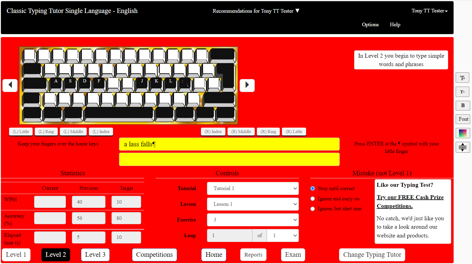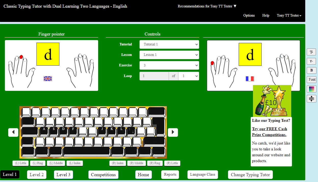 To celebrate the 2023 World Typing Day we’re not only holding our £100 cash prize speed typing competition, we’re also giving away a free one month subscription to all of our Typing and Language Tutor Products. This covers all of our Classic Typing Tutor versions which provide three levels of learning; Level 1 teaches individual keys and which finger is used with particular keys according to the tried and tested Home Key method of typing. Level 2 uses the keys that you’ve just learnt in Level 1 to type individual words and short phrases, and then you move to Level 3 which once again uses the keys you’ve just learnt to type longer phrases and sentences.”