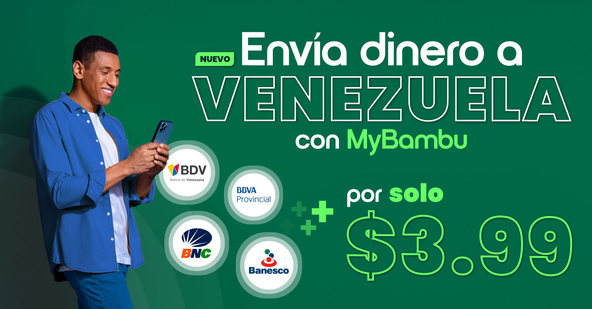 Envía dinero a Venezuela por solo $3.99. Rápido, seguro y directo a bancos o para retiro en efectivo en minutos con MyBambu.