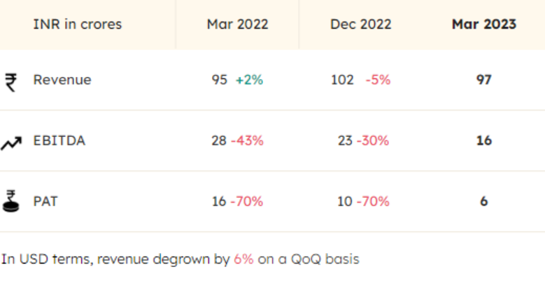 There is softening in demand from a few cautious clients on account of economic slowdown expectation, which is reflected in lower quarterly Revenue, EBITDA and PAT as compared to previous quarters. The Company continues to focus on large enterprise clients who can weather an economic slowdown and onboarded 3 new Fortune 500 clients and 6 new large Enterprise clients (>$1bn) in the current fiscal year taking its tally to 15 Fortune 500 clients and 14 Enterprise clients.